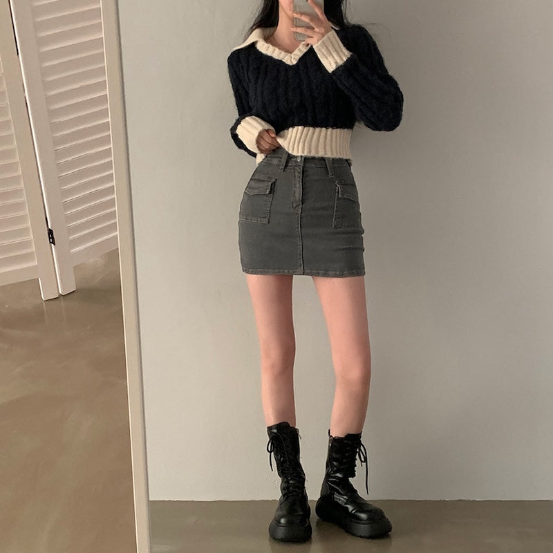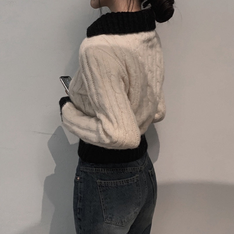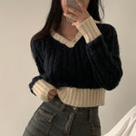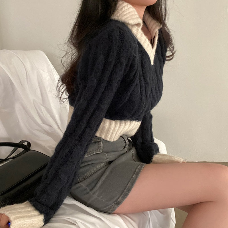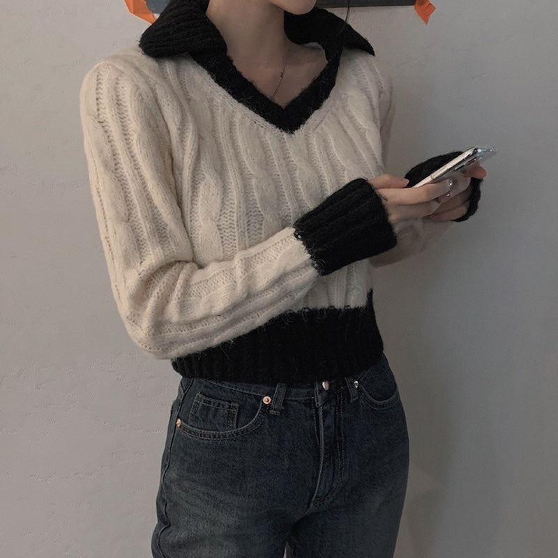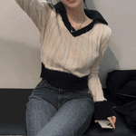 Vネックケーブルポロニット